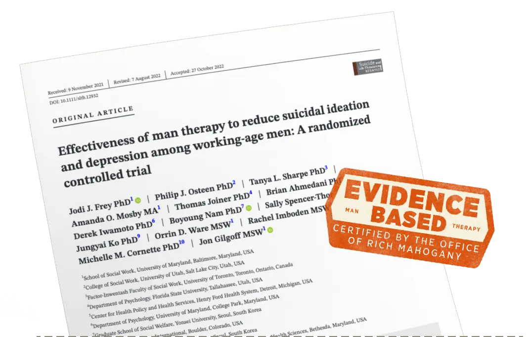 Man Therapy was created by a dream team of suicidologist, mental health experts, marketing strategists, creatives, and technologists to destigmatize mental health through humor, straight-shooting, and practical tools. The best part? It works. The results of a 4-year, $1.2 million CDC-funded study show that Man Therapy not only reduces depression, suicide risk, and bad mental health days — it also improves help-seeking behavior in working-age men.